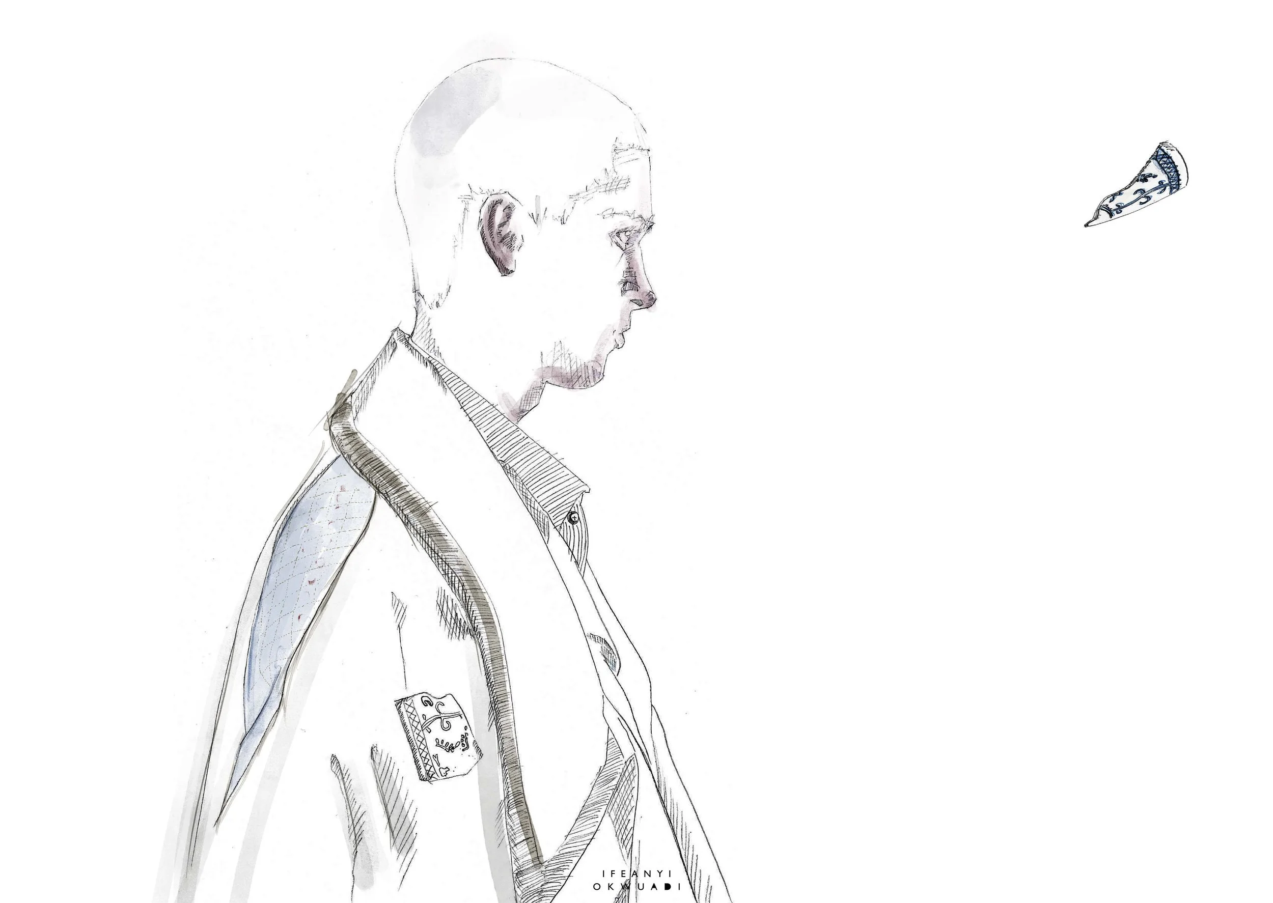 Ifeanyi Okwuadi, born 1994 in Camden, London, studied at West London College for Art and Design while apprenticing on Savile Row at Cad & The Dandy. He then studied Fashion Design at Ravensbourne University and completed a Master’s at Central Saint Martins in 2023.